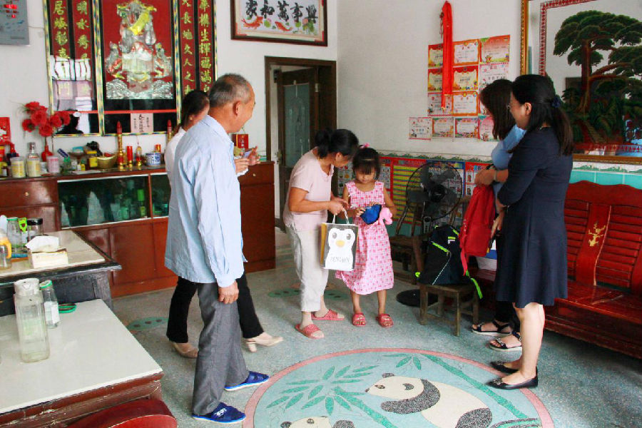 一行三人在观塘村妇联崔主任的带领下,来到了留守儿童许欣雨小朋友家里,许欣雨小朋友目前上小学二年级,父母离异,父亲在外打工,她与爷爷奶奶相依一起生活。帮扶小组工作人员询问了她的学习和生活情况,和她亲切地交谈,并鼓励她好好学习,树立积极乐观的生活态度。